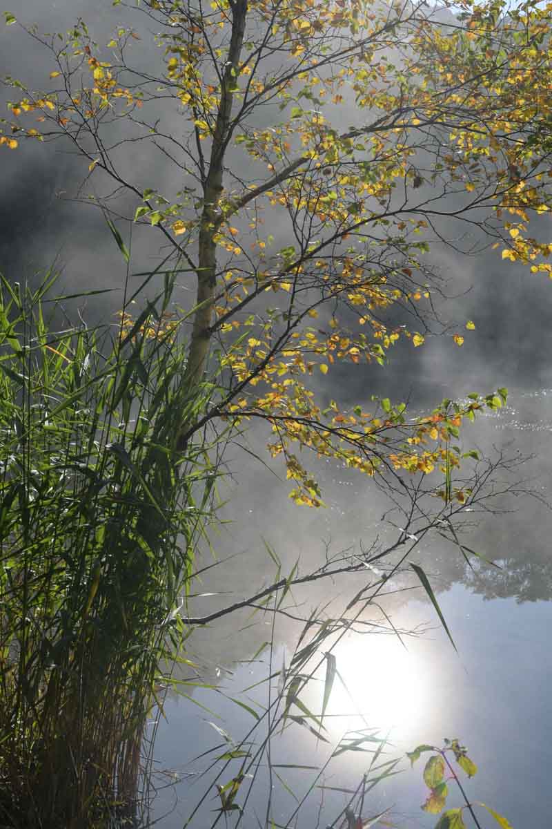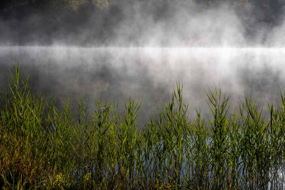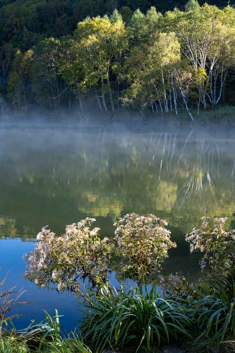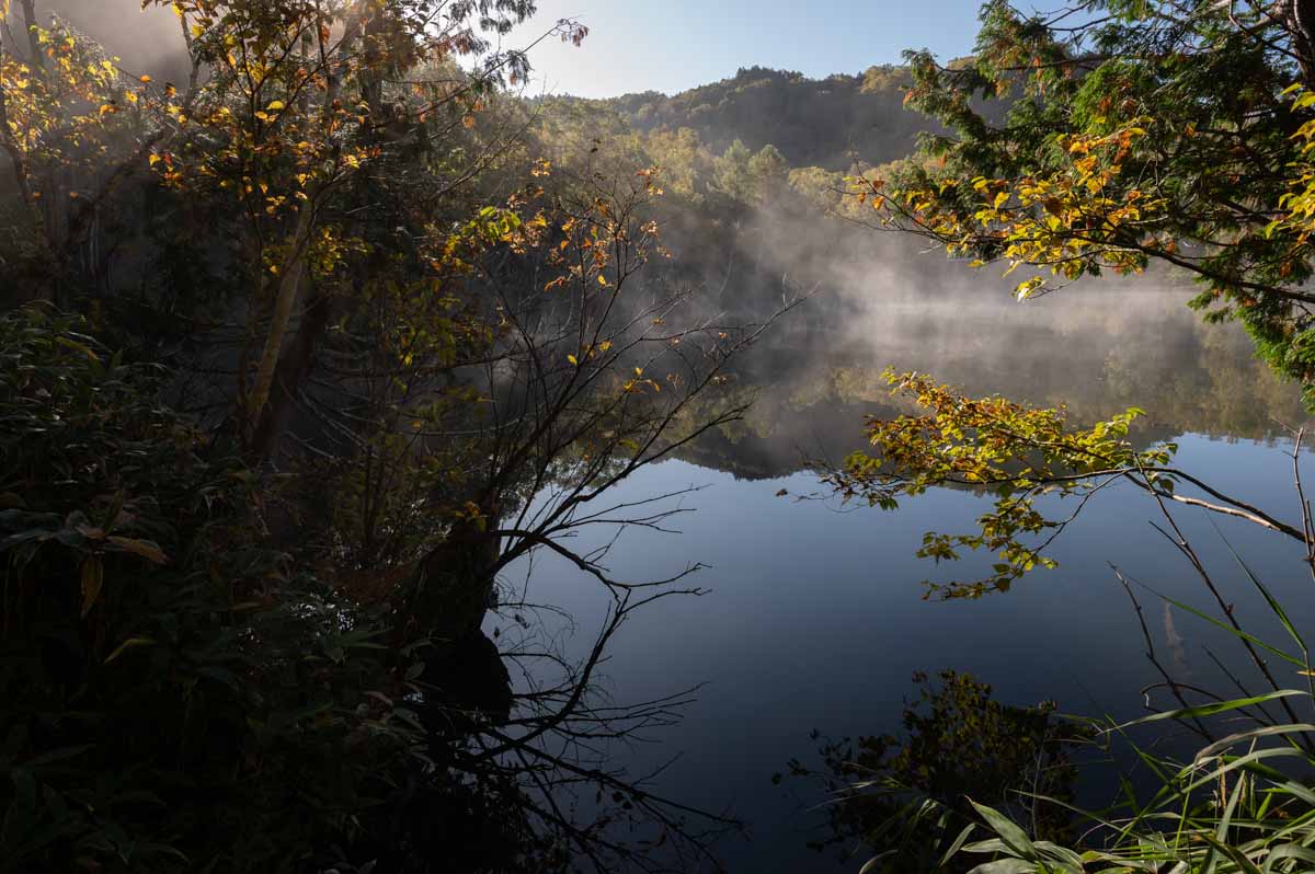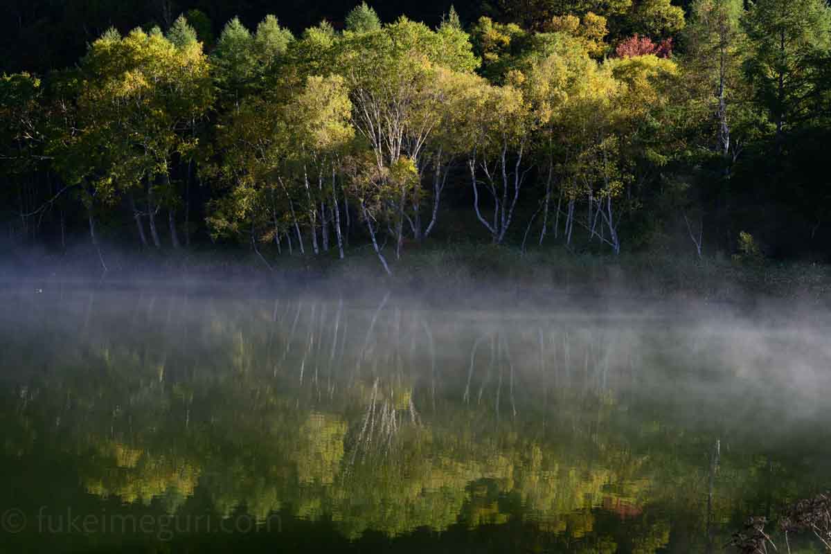 東側から木戸池に流れ込む沢の水が影響しているのでしょうか、東側の水面を中心に霧が流れていました。朝7時くらいでした。