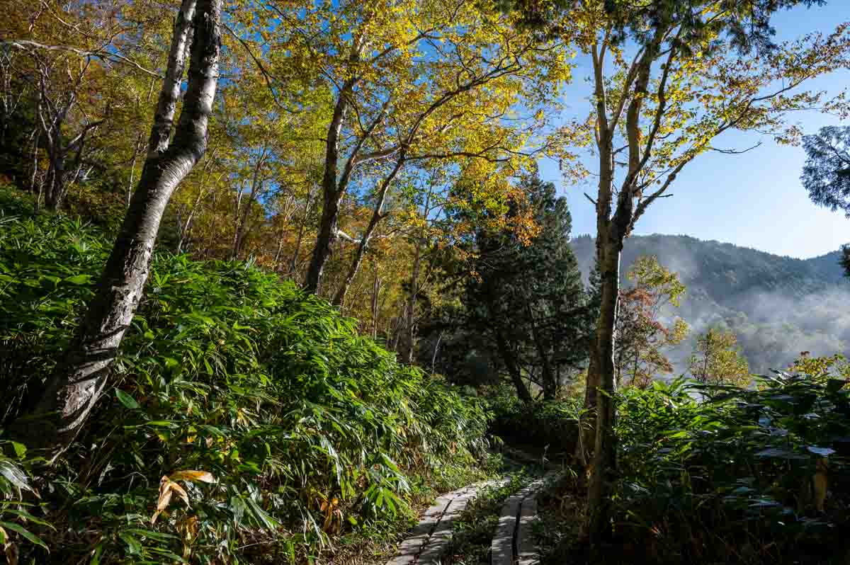 右手を見れば、笹と紅葉越しに霧が立つ木戸池が見えます。