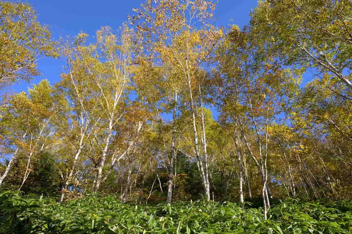 左手の林を見上げれば、黄葉の白樺が立ち並んでいます。