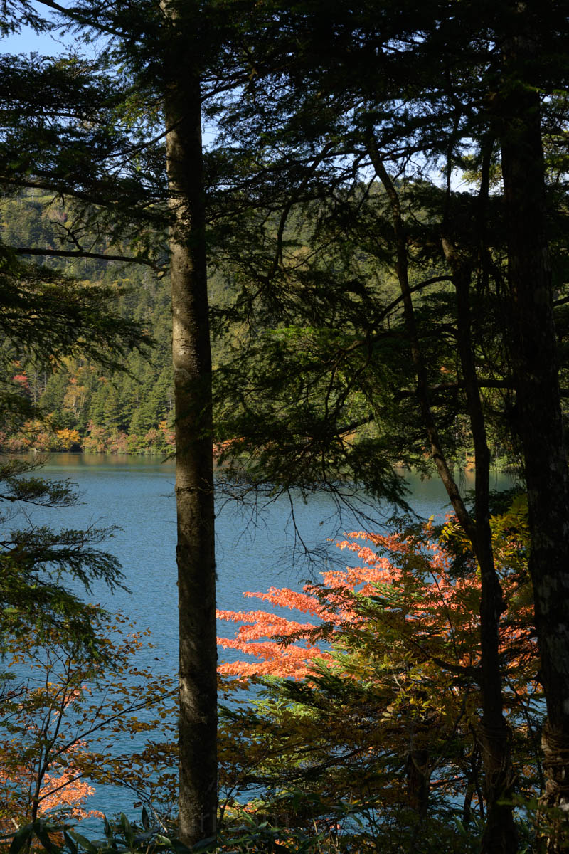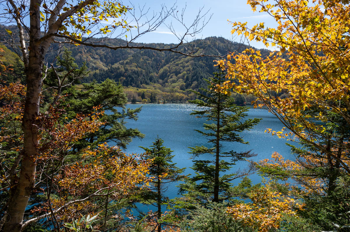 池尻からレストハウス近くまで探勝歩道では、紅葉の木の間越しに大沼池が見えます。