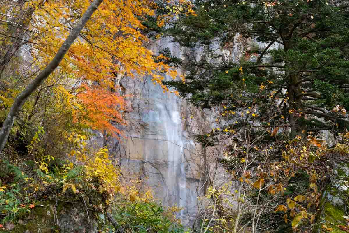 途中、権現滝の方を見ると、枝越しに権現滝が見える場所があります。