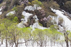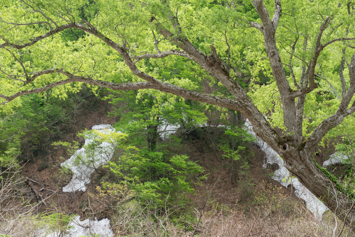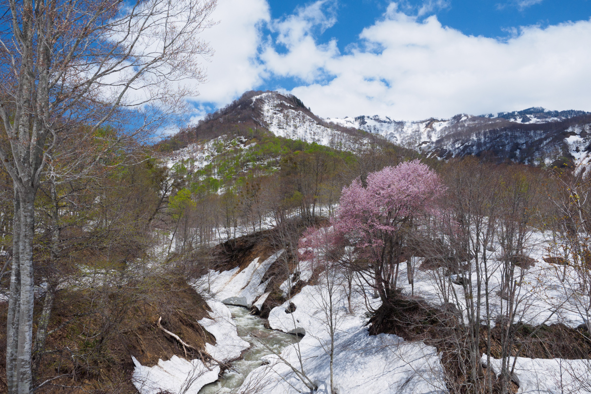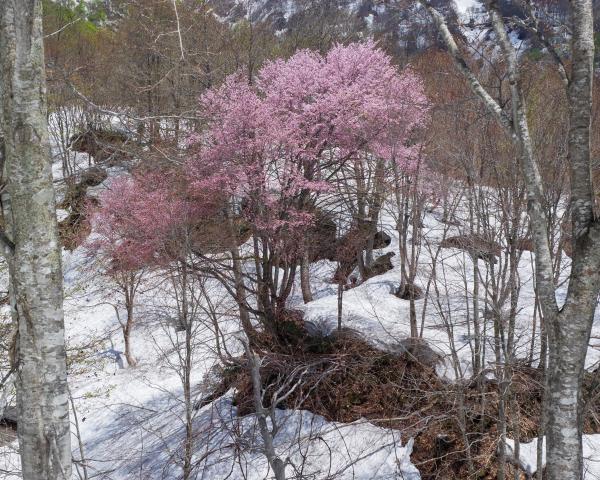 春、つぶれ池周辺に山桜が点々と咲く。 残雪の中に咲く山桜は絶景。