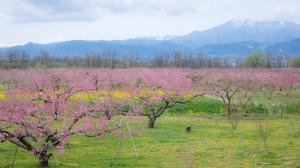 4月下旬、モモの花、菜の花、遠くに残雪の山の景色があります。
